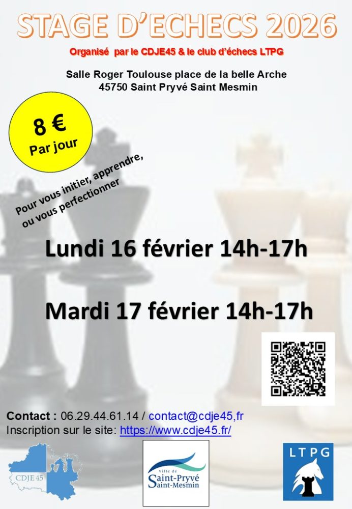 Stage échecs à St Pryvé-St Mesmin les 16 et 17 février 2026