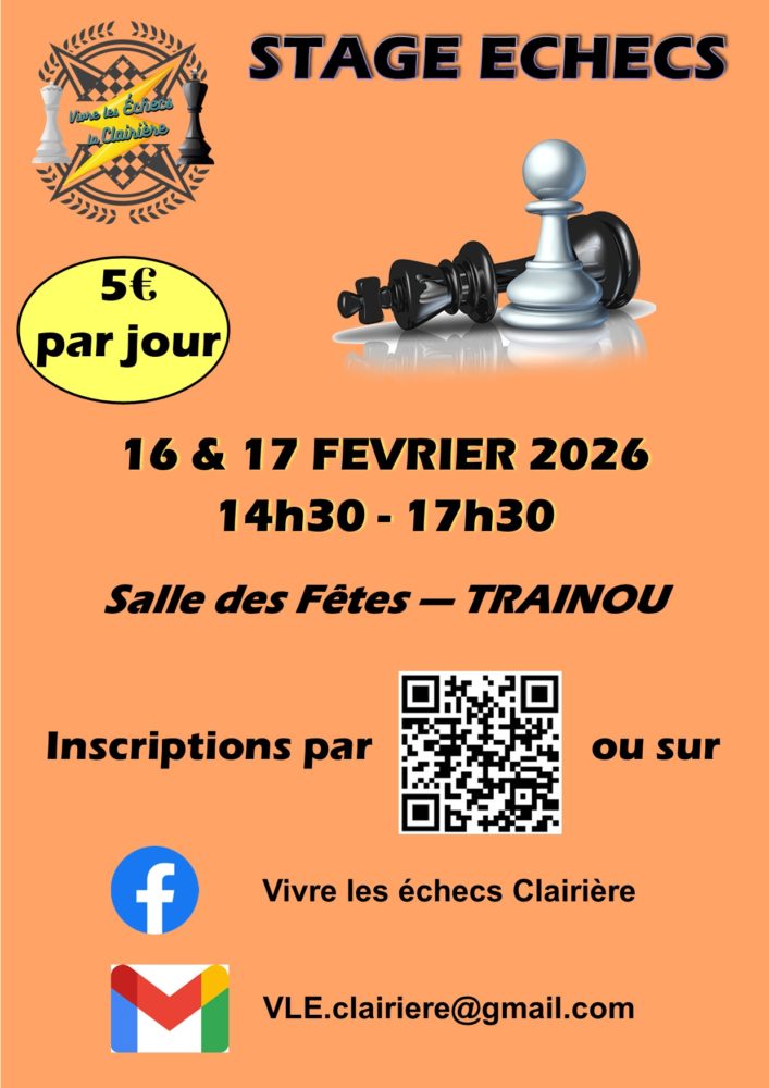 Rejoignez-nous pour un stage d’échecs à Traînou, les 16 et 17 février, à la salle des fêtes de Traînou !