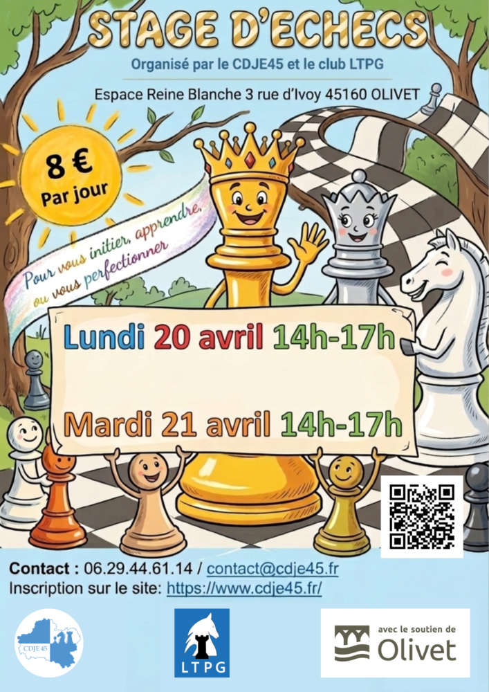 Envie de découvrir le jeu d’échecs ou de faire progresser votre stratégie ? Rejoignez-nous pour deux stages d’échecs ouverts à tous, organisés par le CDJE45 et le club La Tour, Prends Garde !