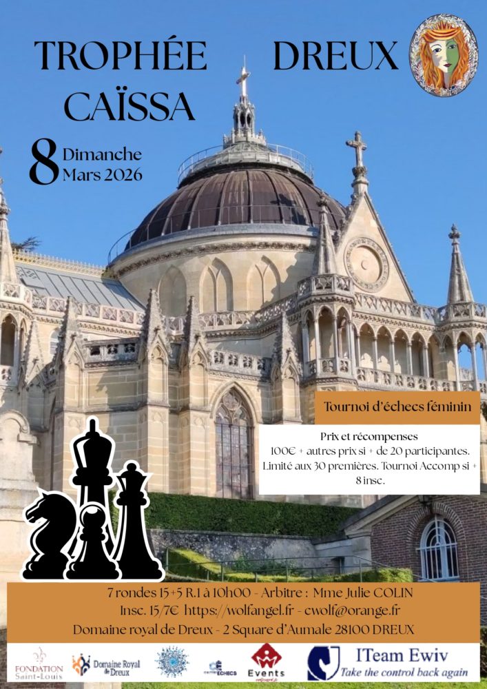 Comme je vous l’ai déjà annoncé ,il y a déjà quelques semaines,je vous rappelle qu’un bel événement échiquéen féminin sera organisé au magnifique domaine royal de Dreux, le dimanche 8 mars avec la collaboration des clubs de Dreux et de Chartres.Excellent accueil assuré, conditions de standing et souvenirs pour toutes…